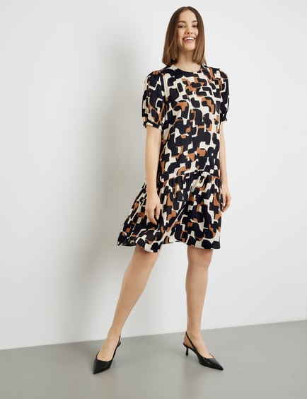 Štýlový kúsok s množstvom trendov! Naše šaty s grafickou celoplošnou potlačou sú skvelou voľbou pre denný aj večerný vzhľad. Uvoľnený strih voľne lemuje vašu siluetu. Naberané rukávy a točitý volánový lem dodávajú ženský nádych, zatiaľ čo tlmené farby lichotia akémukoľvek typu pleti a ponúkajú nespočetné možnosti stylingu.