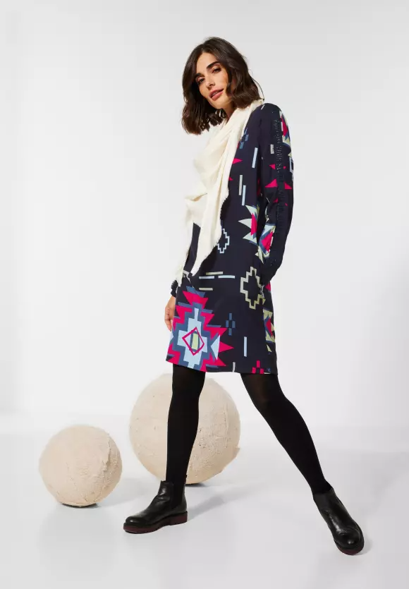 výkon tlače! Dámske šaty CECIL s jesennou potlačou. Okrúhly výstrih je zvýraznený krátkym zipsom. Mäkká viskóza je ľahká, vzdušná a príjemná na nosenie.