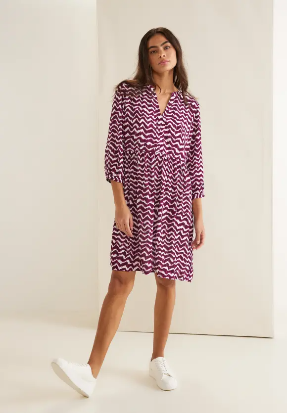 Tunikové šaty voľného strihu od Street One, ktoré sú stupňovité a vyrobené z mäkkej viskózy, ktorá sa ľahko splýva a jemne hladí nohy v dĺžke po kolená. 3/4 rukávy šikovne skrývajú a rozparkovaný okrúhly výstrih decentne dotvára scénu dekoltu.