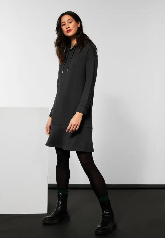 Dobré úmysly! Útulné svetríkové šaty od Street One, ktoré získavajú športový vzhľad vďaka kapucni so sťahovacou šnúrkou. Vyšívaný nápis na prednej strane jemne priťahuje pozornosť na jednofarebnej farbe. Padnuté ramená a mierne rozšírený spodný lem zaisťujú ležérny strih.