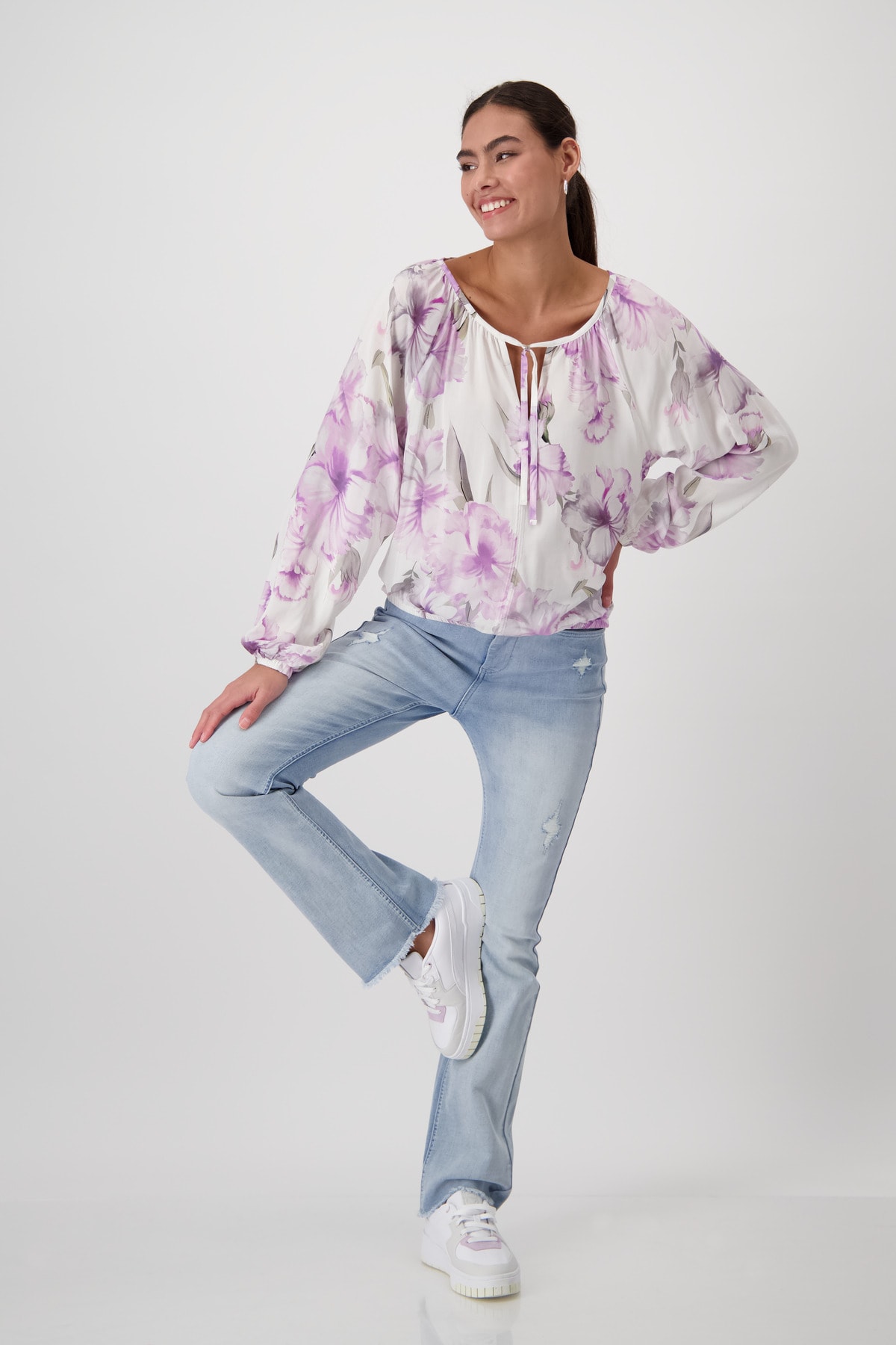 Táto kvetinová blúzka vyrobená zo 100% viskózy má okrúhly výstrih s rozparkom a kravatou.