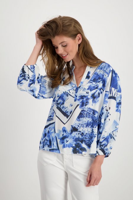 Naša vzdušná blúzka s polaroidovým vzorom je vyrobená zo 100% udržateľnej viskózy EcoVero. Okrúhly výstrih s rozparkom a lem rukávov s gumičkou zaisťujú pohodlný a moderný vzhľad.