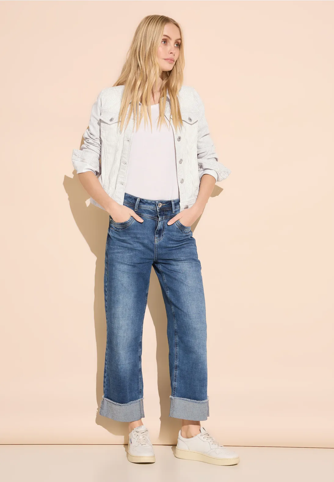Pruhovaná riflová bunda od Street One pre ženy je štýlová prechodná bunda v béžovej farbe. S klasickým golierom, gombíkovou légou a náprsnými vreckami stelesňuje moderný šik. Tento všestranný univerzál je nadčasový favorit, ktorý možno bez námahy integrovať do rôznych outfitov.