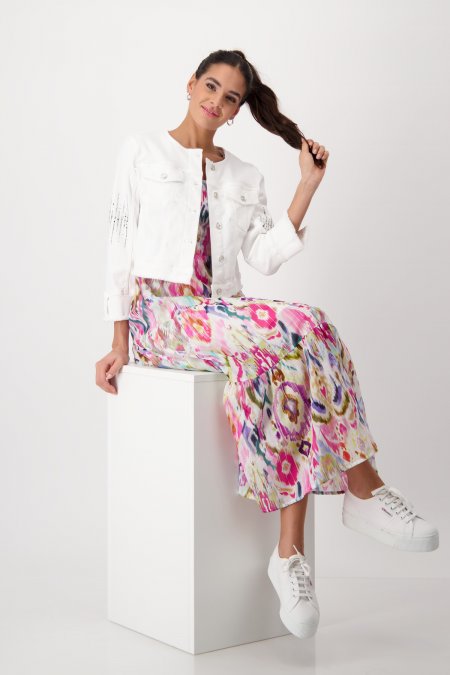 Táto trendová bunda zaujme hravým lemom so strapcami a drahokamami na rukávoch.