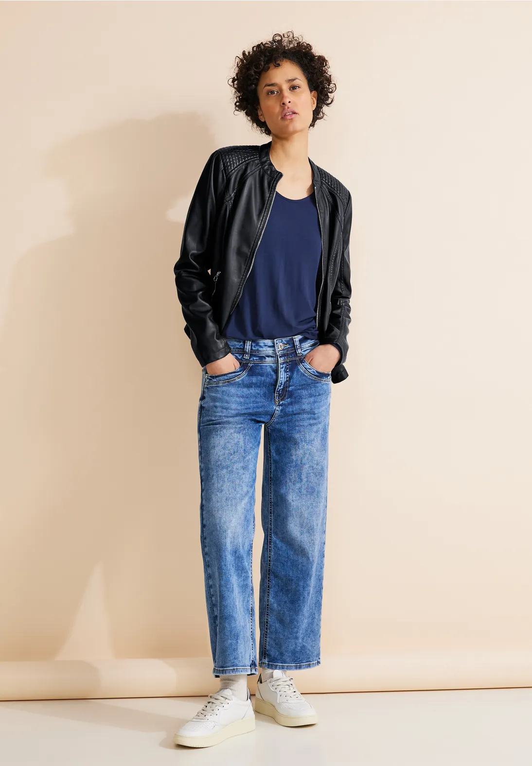 Bunda koženého vzhľadu od Street One je štýlovým spoločníkom s ľahkým stojačikom, zipsom a uzamykateľnými vreckami. Táto dámska bunda v motorkárskom štýle vám umožní kombinovať cool outfity, pričom vnútorná podšívka zaistí pohodlné nosenie. S touto PU bundou môžete vytvoriť ležérny a trendy vzhľad.