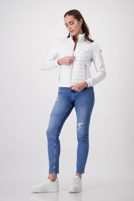 Táto lesklá prešívaná bunda s kvalitným neoprénom na stojačiku, dlhých rukávoch a bokoch je ľahká a bezstarostná.