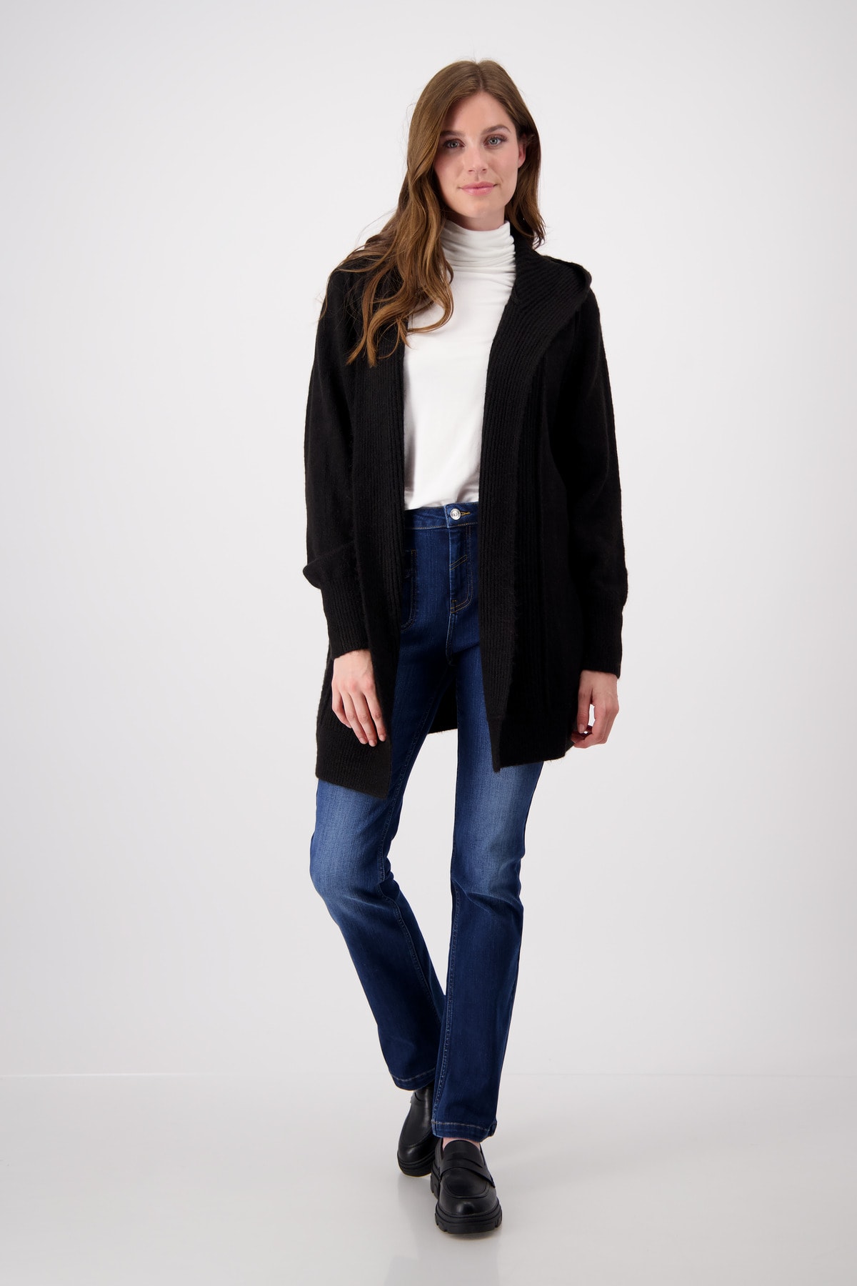 Kardigán je pletený v útulnom vzhľade s rebrovanými detailmi. Mäkká polyakrylová zmes a dlhý tvar s kapucňou poskytujú faktor dobrého pocitu.