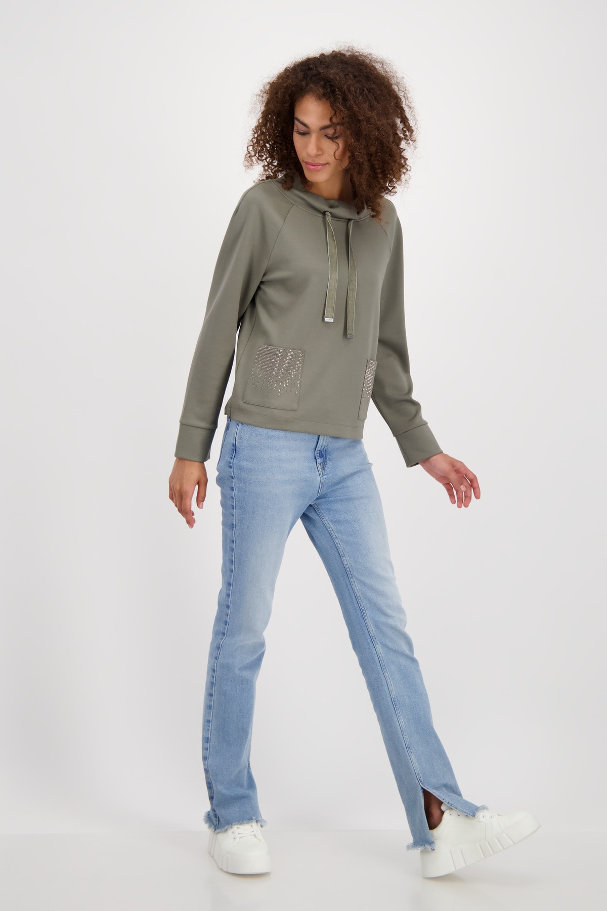 Mikina vyrobená z obzvlášť mäkkého materiálu zaujme dvoma našitými vreckami s trblietavými kamienkami vpredu.