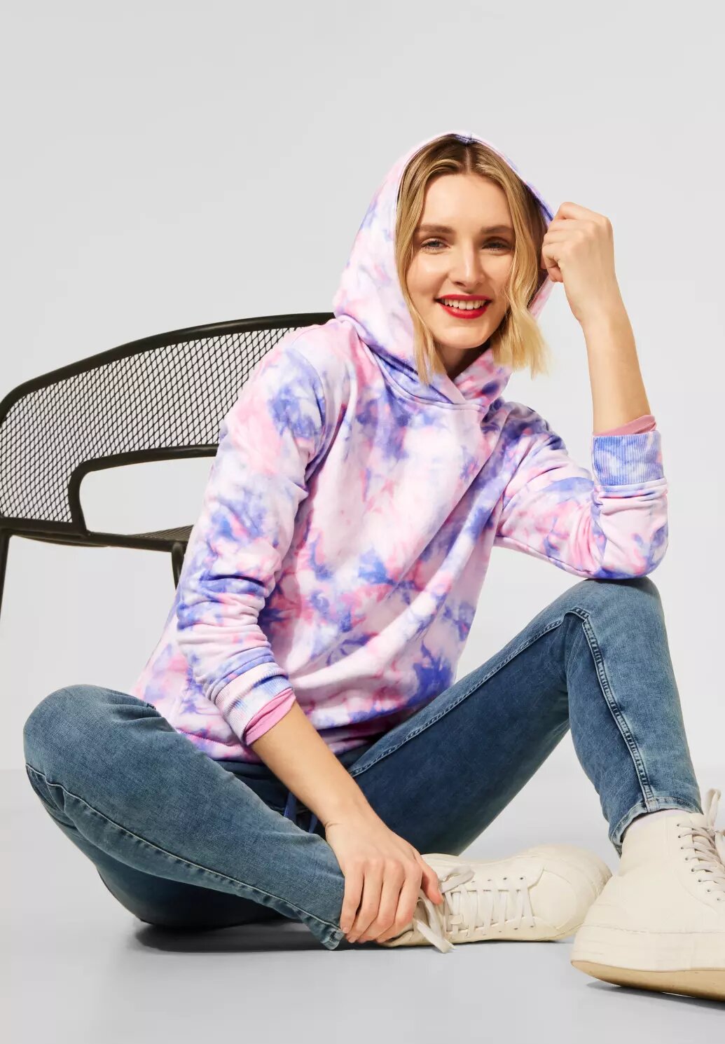 Dámska mäkká mikina od značky Street One. V mikinovom štýle s kapucňou a pohodlným strihom sa stane vaším obľúbeným spoločníkom na pohodové dni. Detail uzla na leme je sofistikovaným doplnkom. Farebný batikovaný vzhľad poskytuje farebný nádych počas sivých jarných dní.