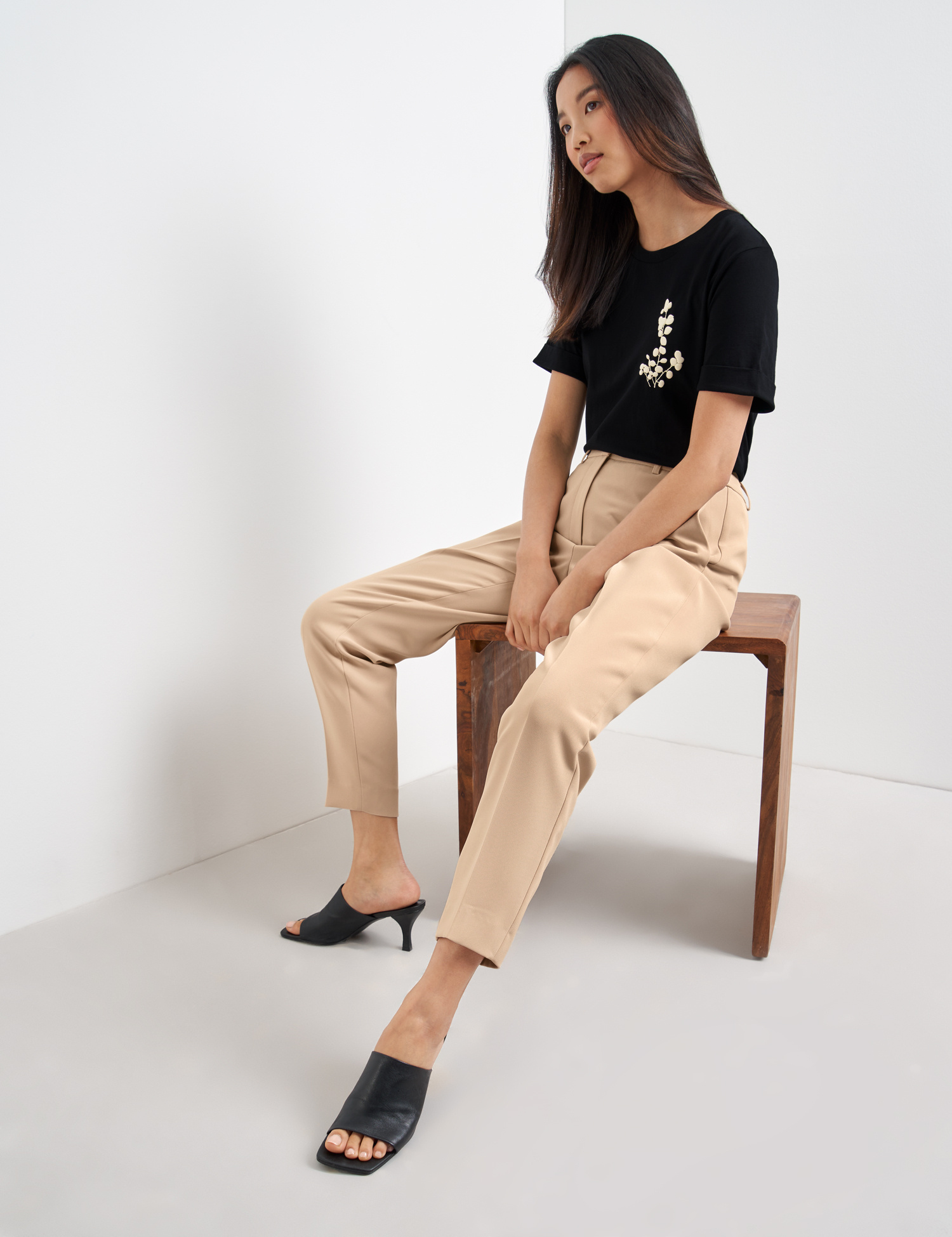 Elegantná tkanina s pridanou pružnosťou zaisťuje pohodlný pocit. Klasický štýl so štíhlou nohou a lisovanými záhybmi.