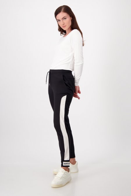 Svieže kontrastné pruhy zdobia boky ležérnych joggingových nohavíc.