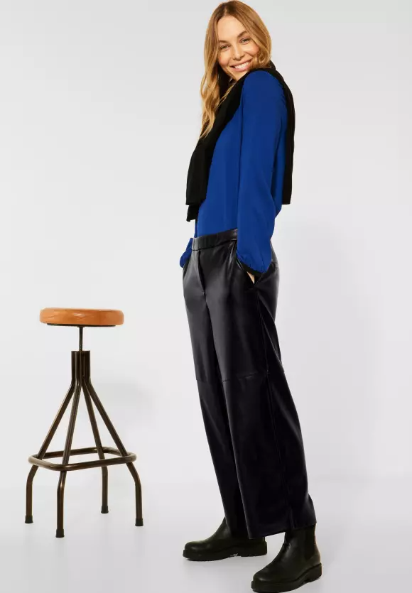 Trendová časť! Dámske nohavice ležérneho strihu značky CECIL zaujmú trendovým koženým vzhľadom. V strednom páse a s elastickým pásom sedí veľmi pohodlne. Cool culotte štýl ležérne zinscenujú široké nohavice. Vzhľad dopĺňajú praktické bočné vrecká.