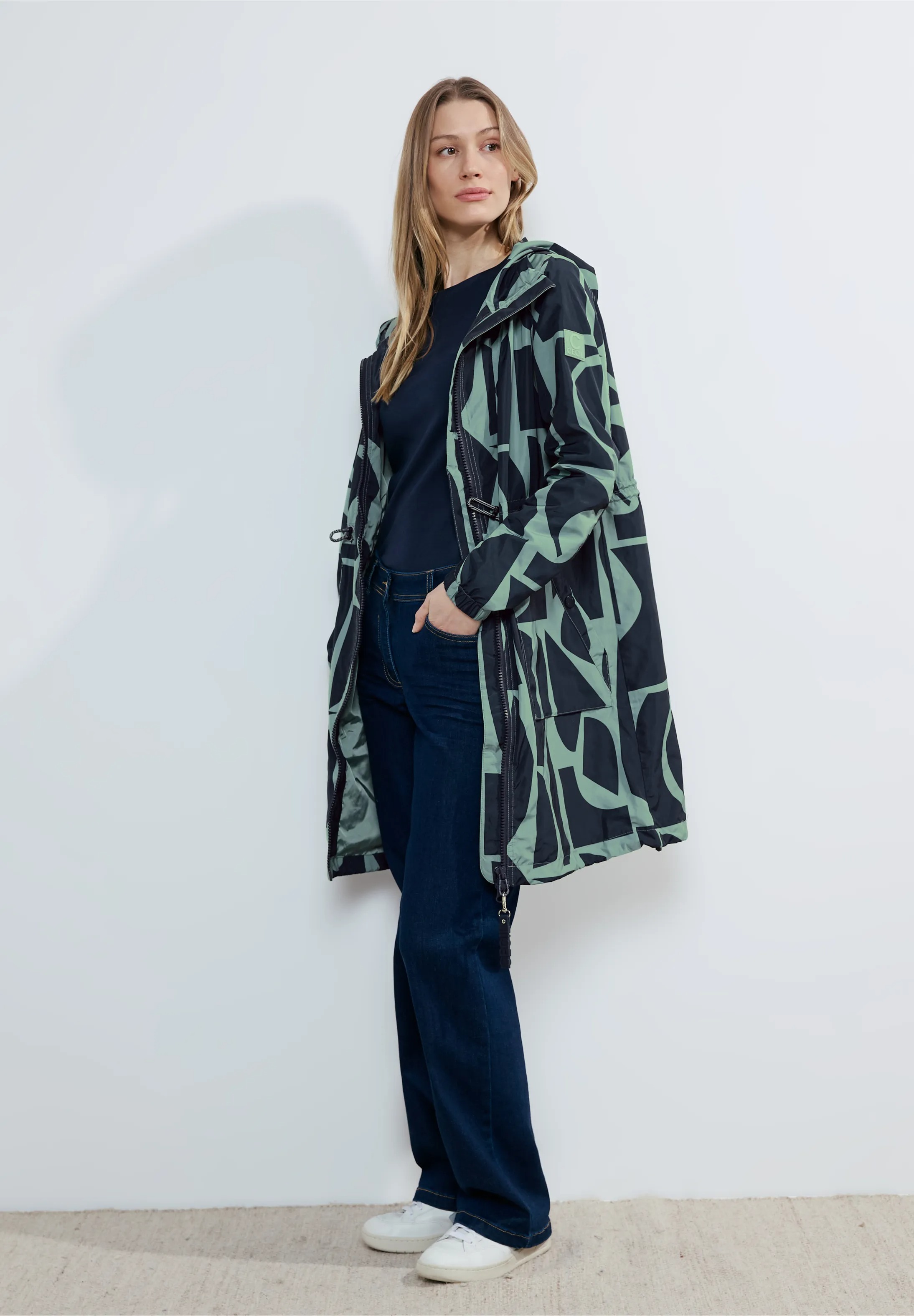 Jednofarebný prechodný kabát od CECIL s kapucňou, 2-cestným zipsom, zarážkami a praktickými vreckami je nielen funkčný, ale aj športový.