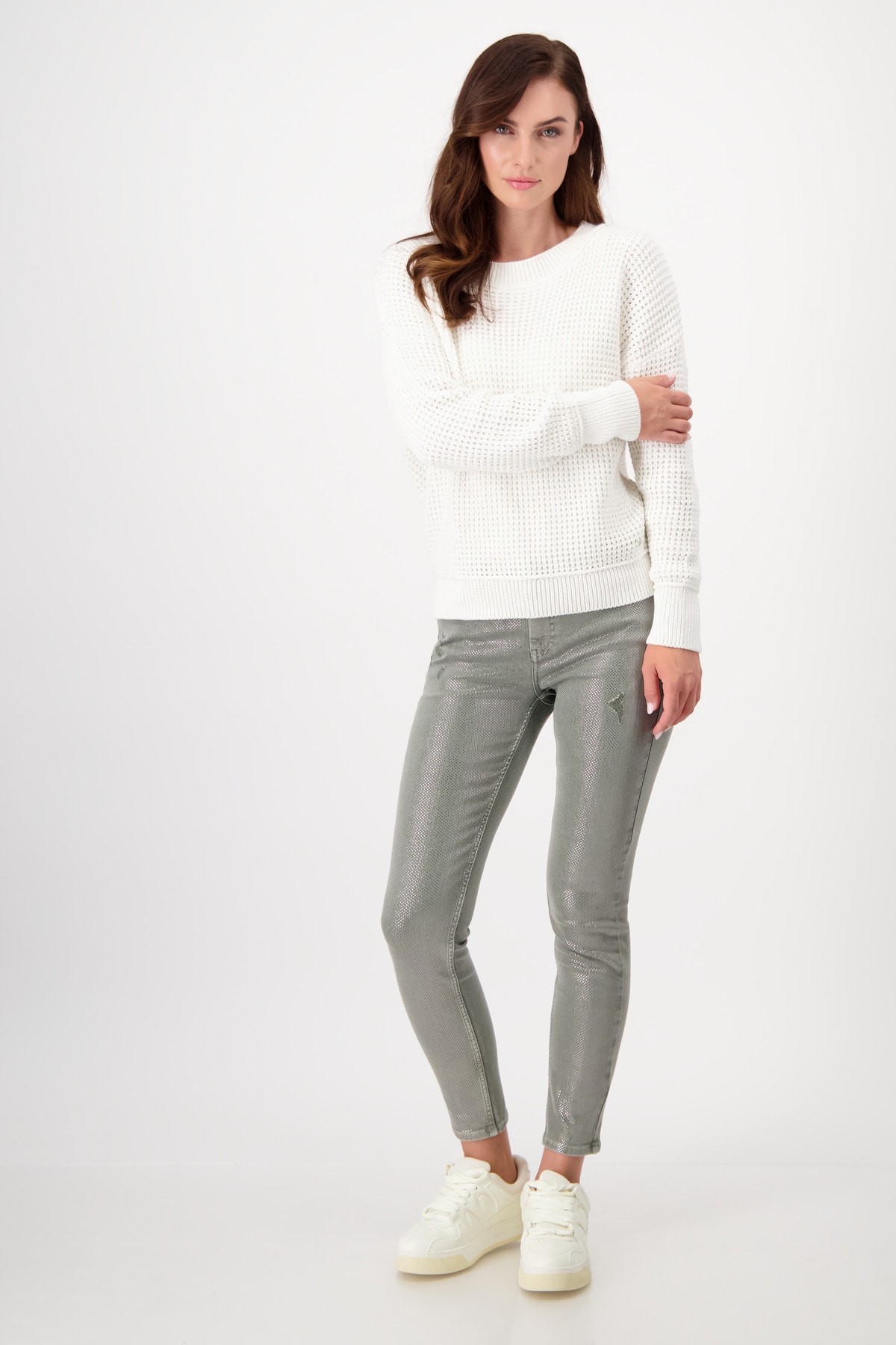 Sveter zaujme štýlovým vzorom úpletu Ananás a ležérnym tvarom s rebrovaným stojačikom.