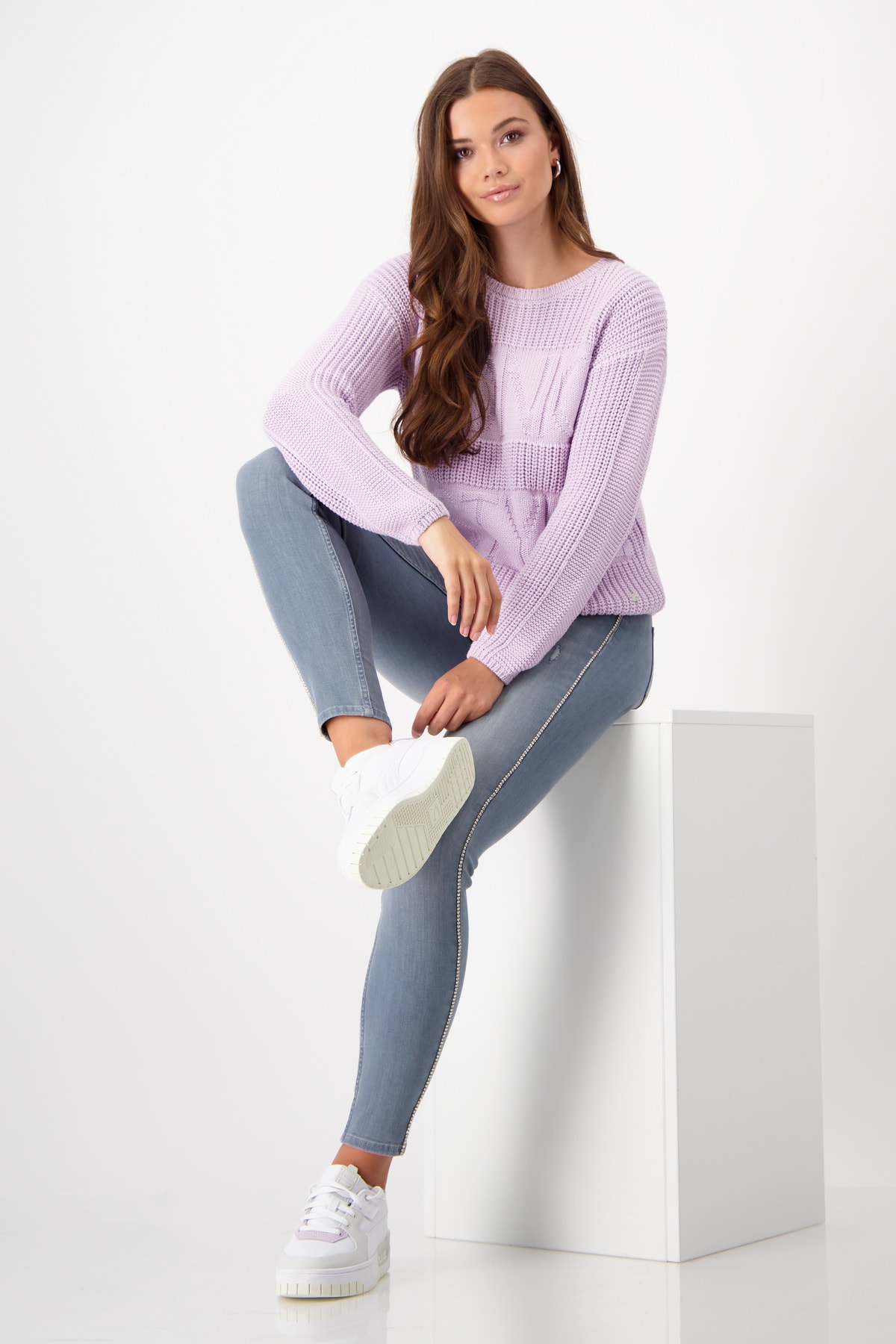 Tento pulover zo 100% bavlny so vzorom lapača perál a vzorom pančuchového stehu je zdobený nápisom na prednej strane.