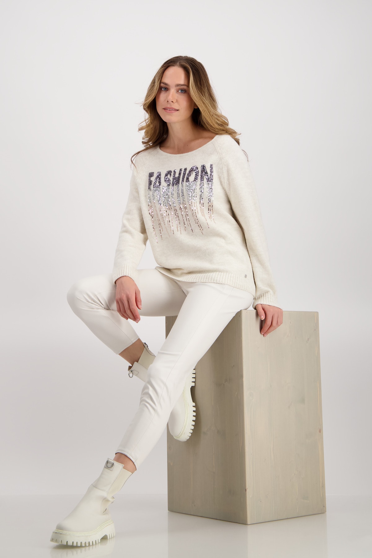 Na prednej strane je umiestnený módny flitrový nápis, ktorý sveter očarujúco zvýrazňuje.