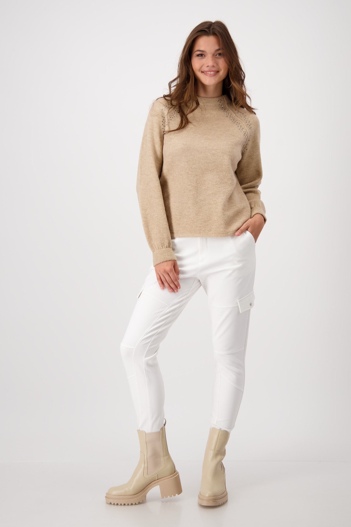 Mäkký plyšový sveter je prevlečený lurexovou niťou a dodáva elegantný lesk. Trblietavé kamienky pozdĺž raglánového švu vytvárajú očarujúci povrch.