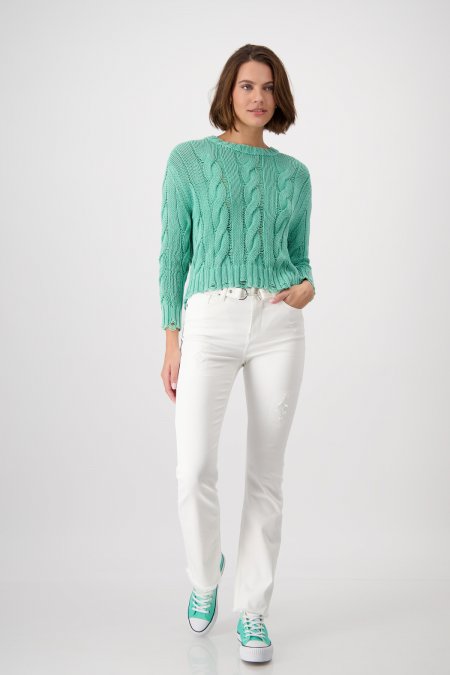 Pohodlný sveter zo 100% bavlny zaujme módnym káblovým vzorom a rebrovanou štruktúrou.