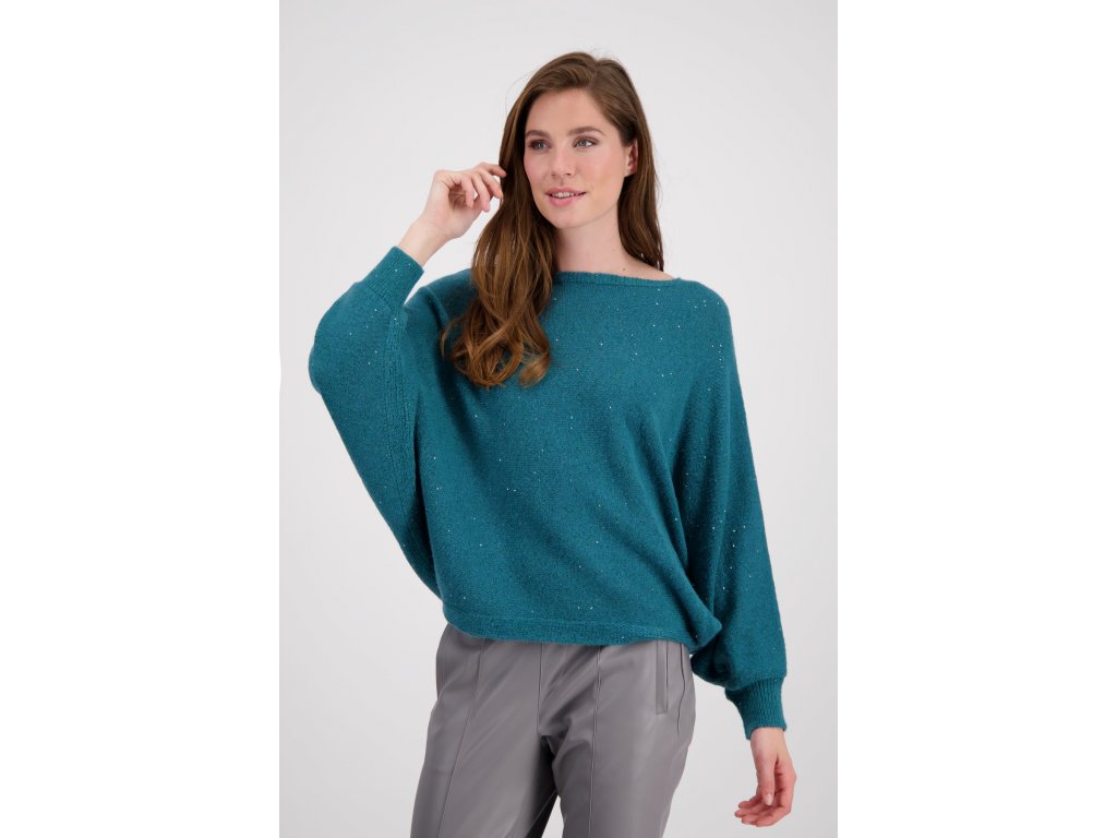 Jemné flitre zdobia sveter s netopierími rukávmi a vytvárajú jemné odlesky. V kombinácii so širokým strihom sveter pôsobí športovo a elegantne.