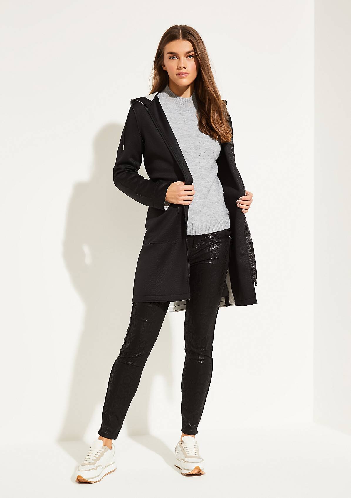 Okrúhly výstrih s dlhými rukávmi ukenčené širokými rebrovanými pletenými manžetami.