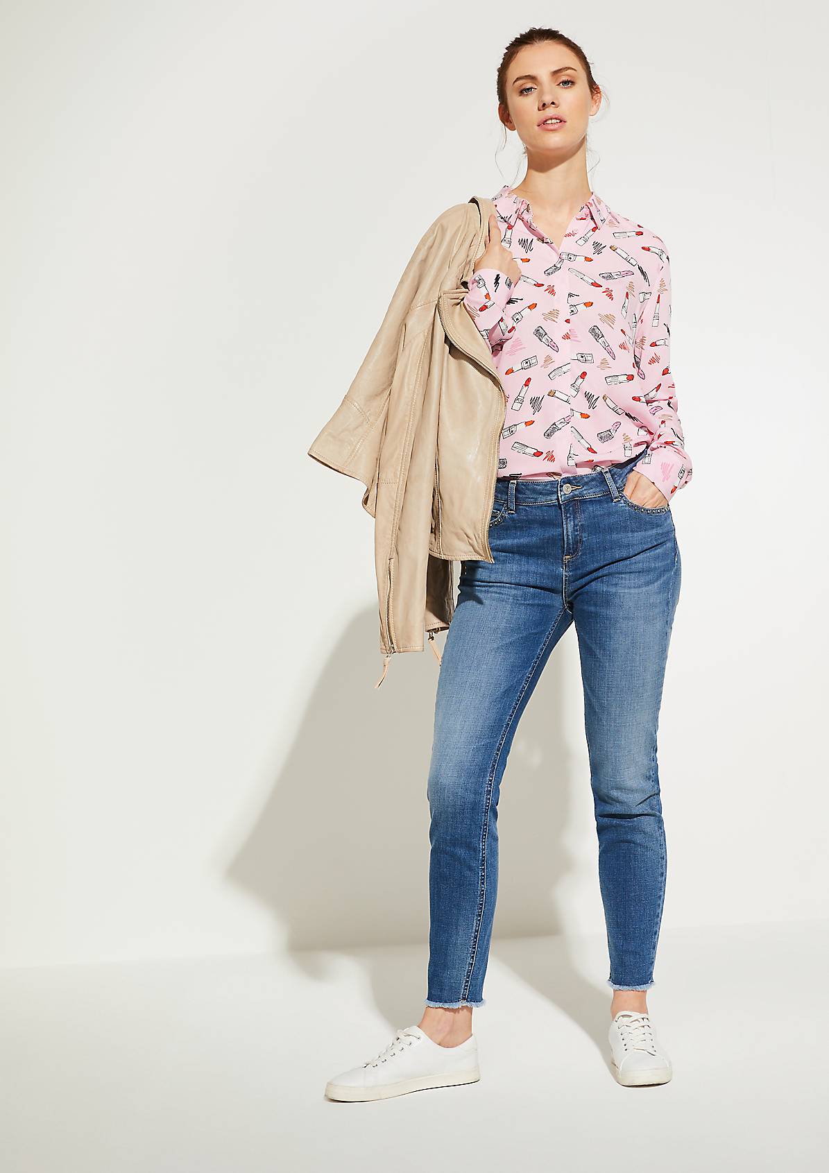 Zapínaniena gombík a skrytý zips, rozstrapkaný lem, strih slim fit