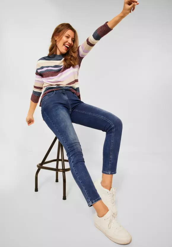Džínsová láska! Džínsovina voľného strihu v štýle Scarlett od CECIL. Vďaka strednému pásu a tenkým nohám zaručujú džínsy ženský a klasický strih. Štýl s 5 vreckami je ležérny a modré pranie je obľúbenou kombináciou.