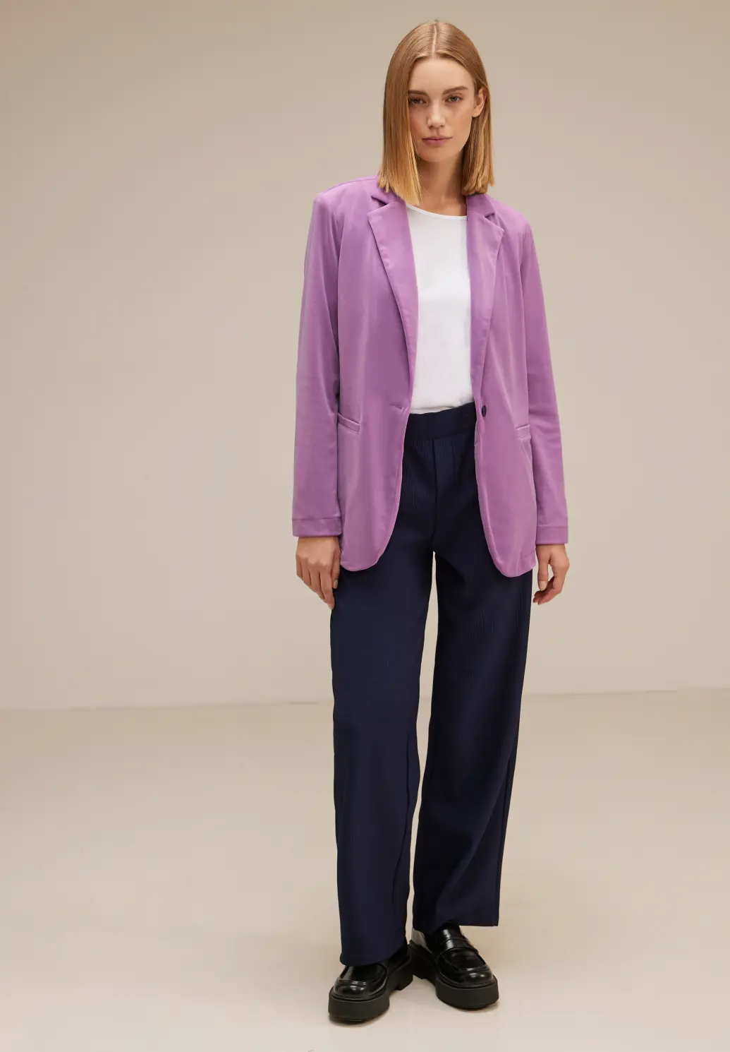 Zamatový blejzer Street One s chlopňovým golierom, vreckami a zapínaním na gombíky je dokonalým doplnkom k outfitu na párty alebo udalosti.
