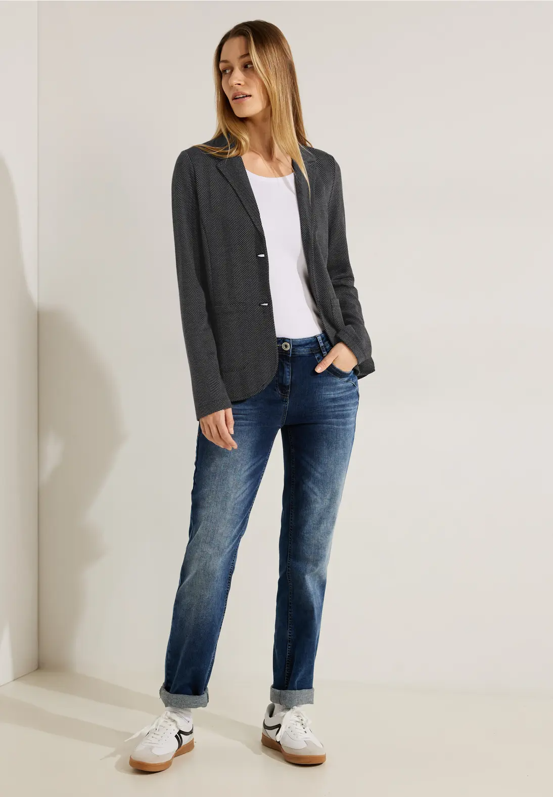 Štýlové a pohodlné! Dámsky blejzer od CECIL s chlopňovým golierom, vreckami a zapínaním na 2 gombíky je všestranným kusom oblečenia. Tento dámsky blejzer má vzor rybej kosti a kvalitný džersej so strečom zaisťuje pohodlné nosenie. Či už ho nosíte do kancelárie alebo vo voľnom čase, toto sako dodá vášmu vzhľadu moderný nádych.