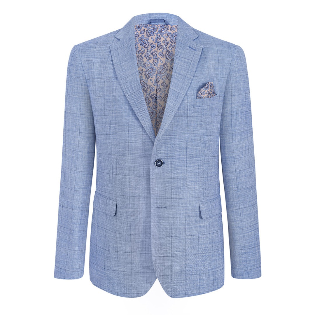 Elegantné, moderné pánské svetlomodré sako s jemnou kockou strihu SLIM FIT dokonale zdôrazní prednosti mužskej postavy.