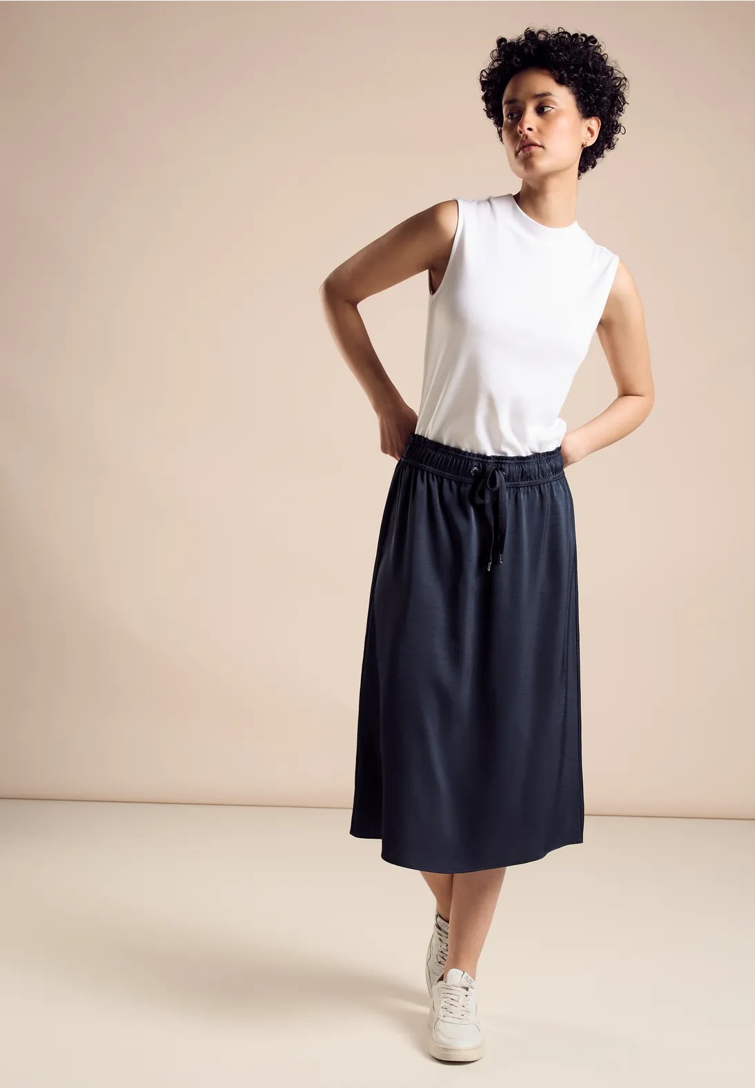Dámska midi sukňa v jednofarebnej papierovej taške od Street One má sťahovaciu šnúrku a elastický pás pre individuálny strih a vysoký komfort nosenia.