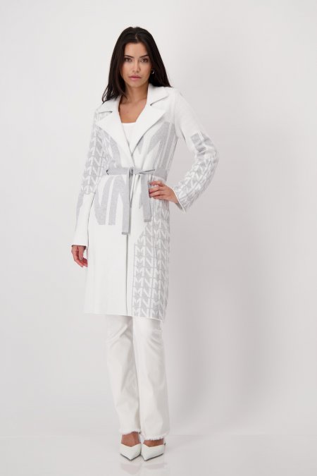 Elegantný pletený kabát zo žakárovej látky s písmenami ponúka pohodlný, prispôsobený strih vďaka šnúrke v páse.
