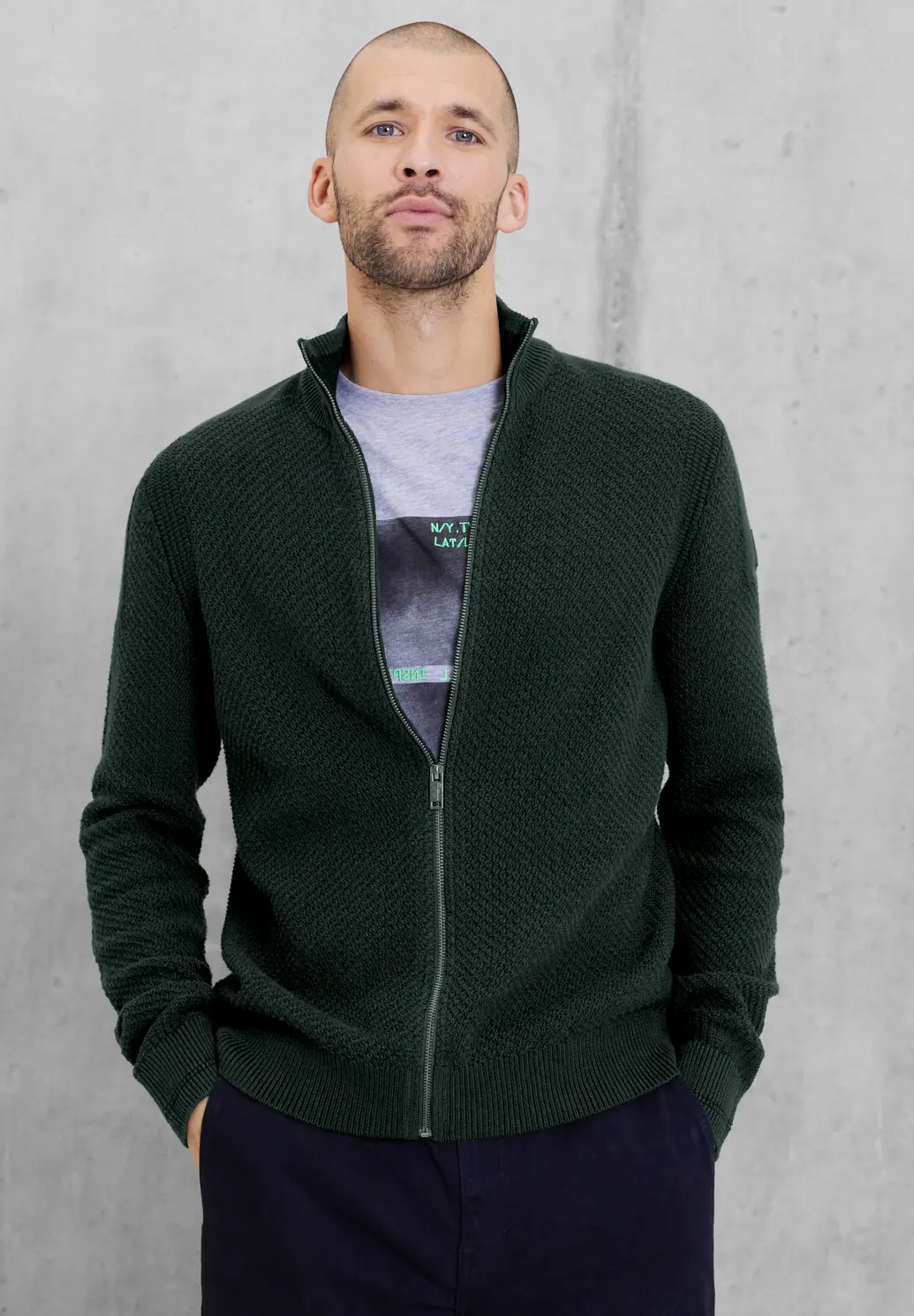 Cool pánsky kardigan Street One MEN so stojačikom a zipsom. Textúrovaný vzhľad dodáva obyčajnej farbe moderný vzhľad. Materiál je príjemný na nosenie a pripraví vás na zimu!