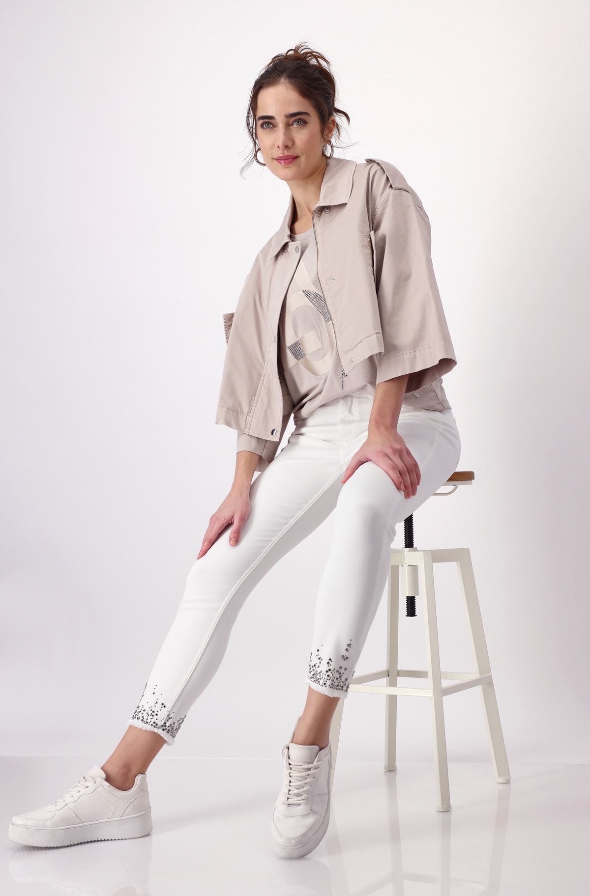 Košeľa vyrobená zo splývavej viskózovej zmesi s jemným pocitom zaujme tónovým písmom, ktoré je zdobené kamienkami.