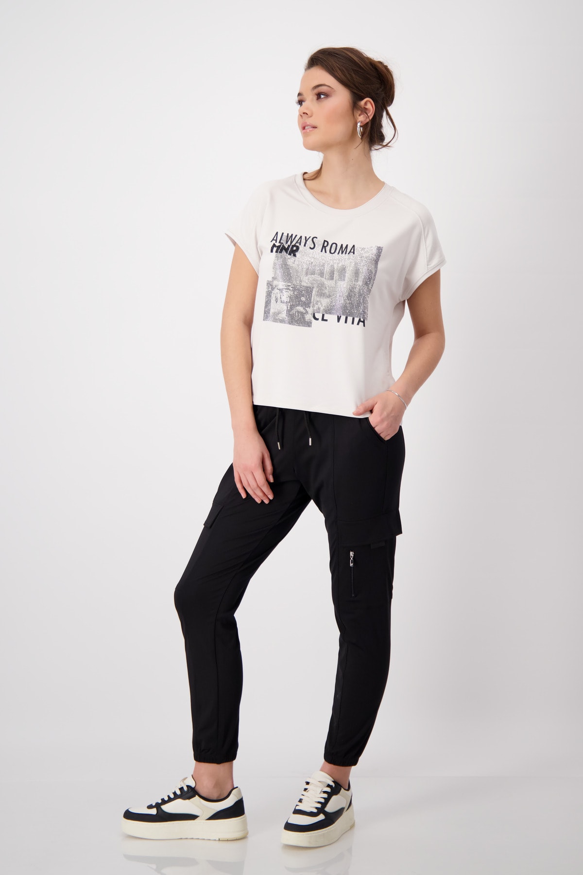 Štýlové tričko s lesklou striebornou potlačou a kamienkovým nápisom.