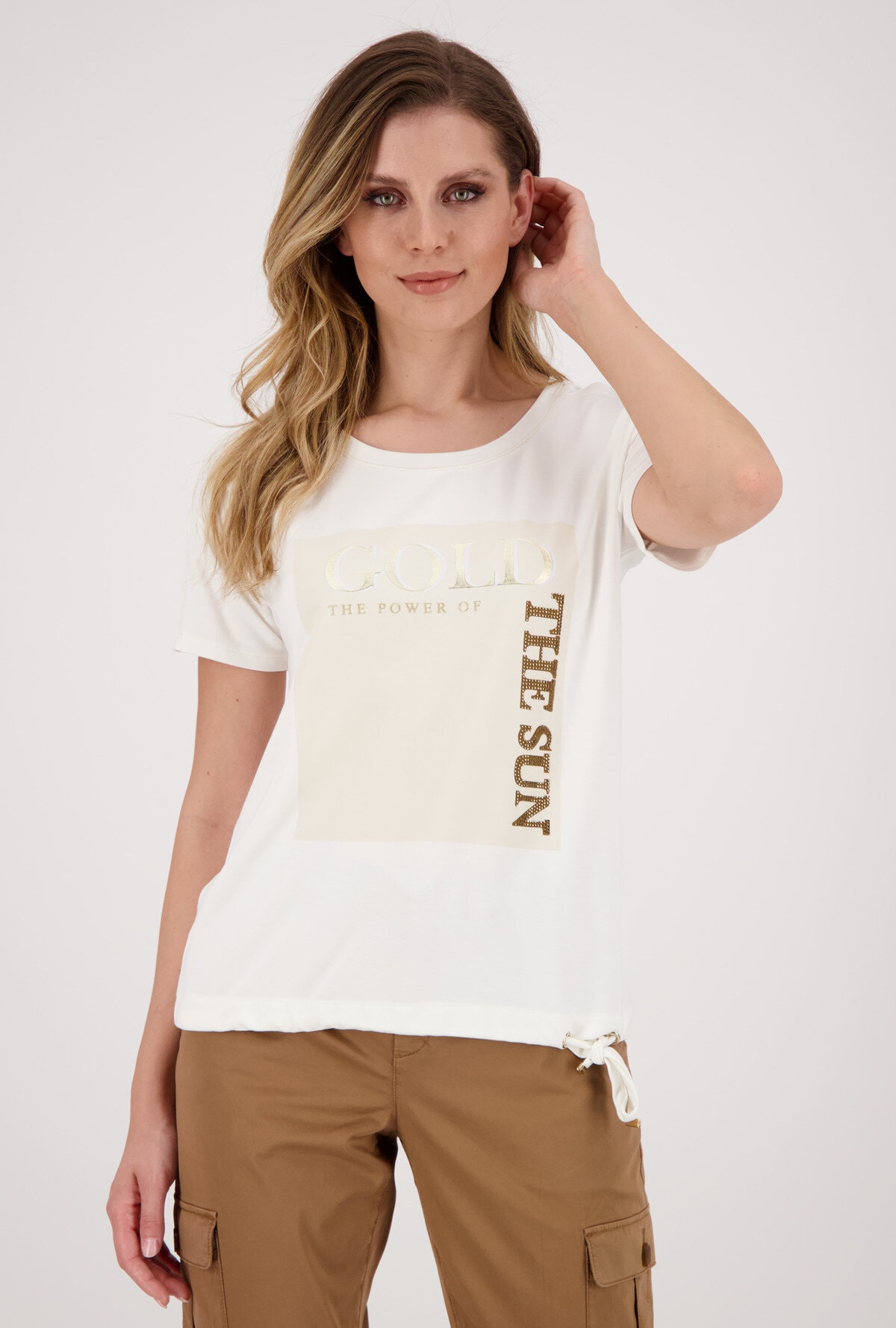 Hľadáte štýlový nový módny top? Čo si myslíte o tejto krásnom tope vyrobenom zo splývavej, obzvlášť jemnej viskózy a modálnej kvality s vysokým percentom elastanu? Top s okrúhlym výstrihom, polovičnými rukávmi, mierne spadnutými ramenami, ramenným sedlom s lurexovým overlockovým švom a lemom so šnúrkou, lesklými krúžkovými očkami a kravatou. Umiestnená potlač v podobe farebného obdĺžnika je doplnená očarujúcim lakom a štrasovým písmom a zdobí prednú časť inak dosť jednoduchého sivobieleho modelu.