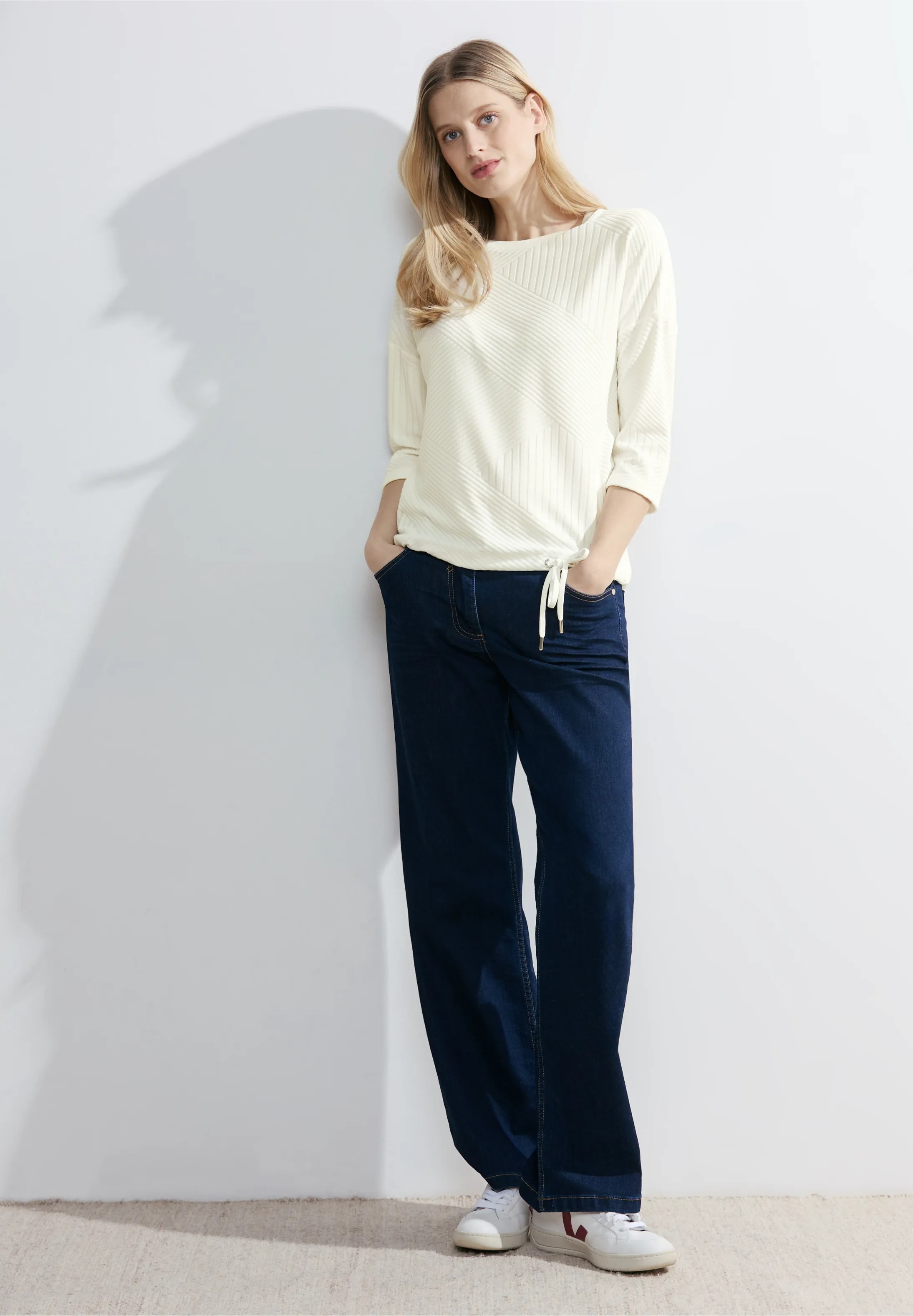 Jednofarebný top od CECIL s 3/4 rukávmi zaujme sťahovacou šnúrkou v páse a zmesou prúžkovej štruktúry.