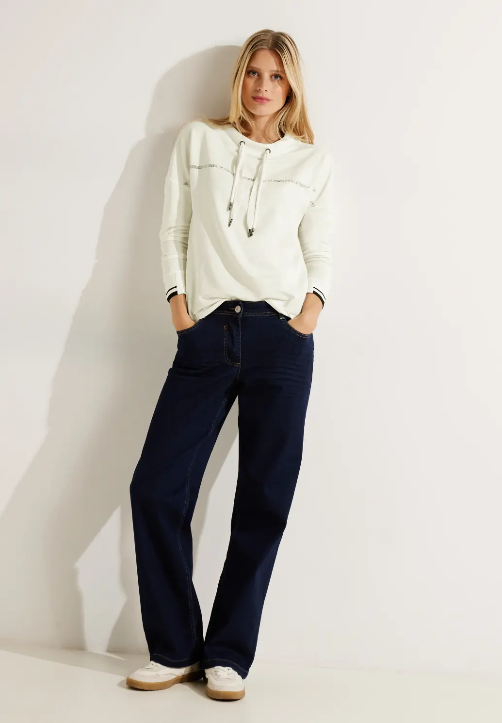 S potlačou textu a v zmesi bavlny a modalu so strečovými a ozdobnými manžetami sedí voľne a pohodlne.