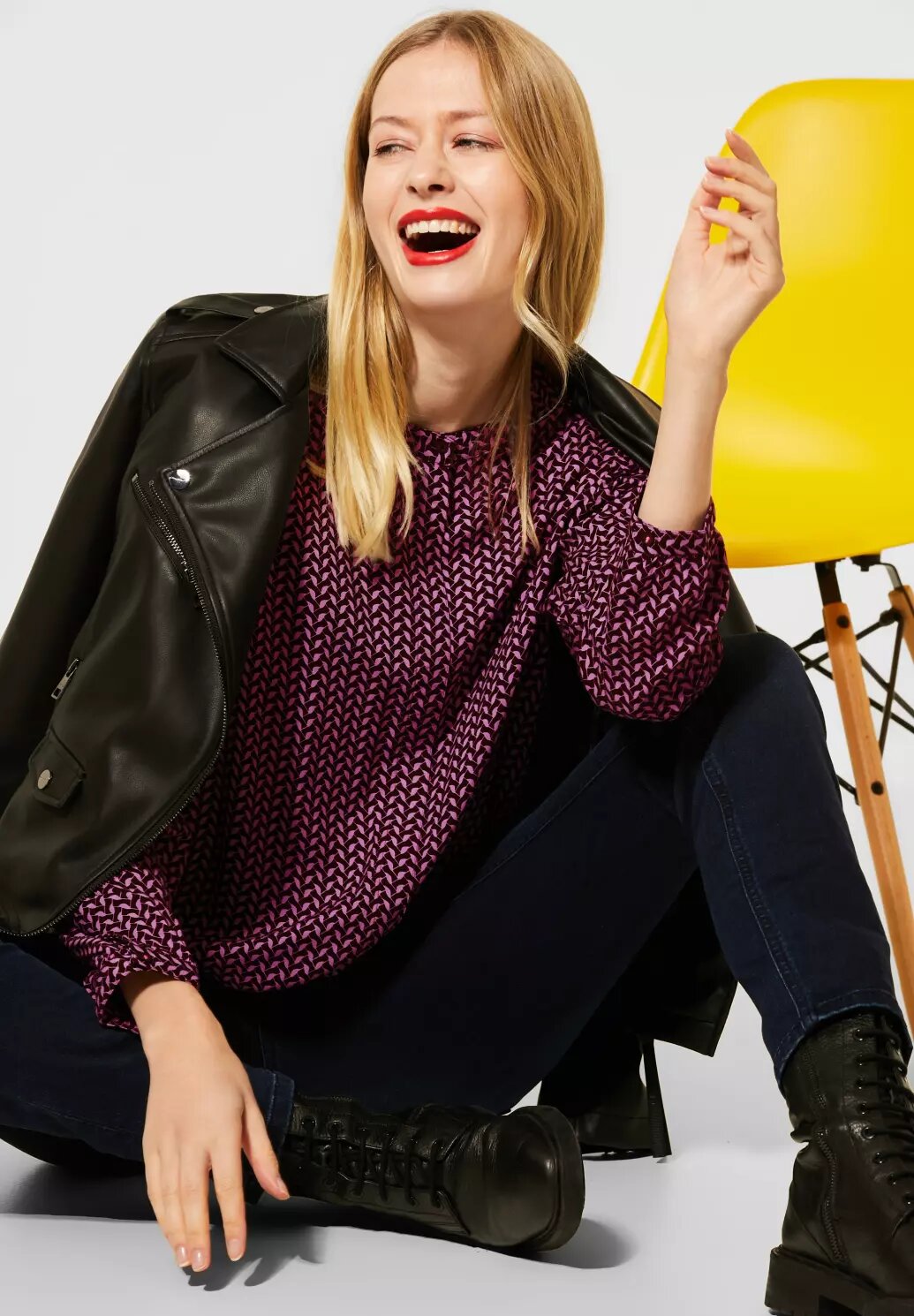 Blúzka Street One je zdobená grafickým vzorom a stáva sa vrcholom outfitu! Ležérny detail je nastavený detailom skrúteného uzla na leme a viskóza je na pokožke príjemne jemná.