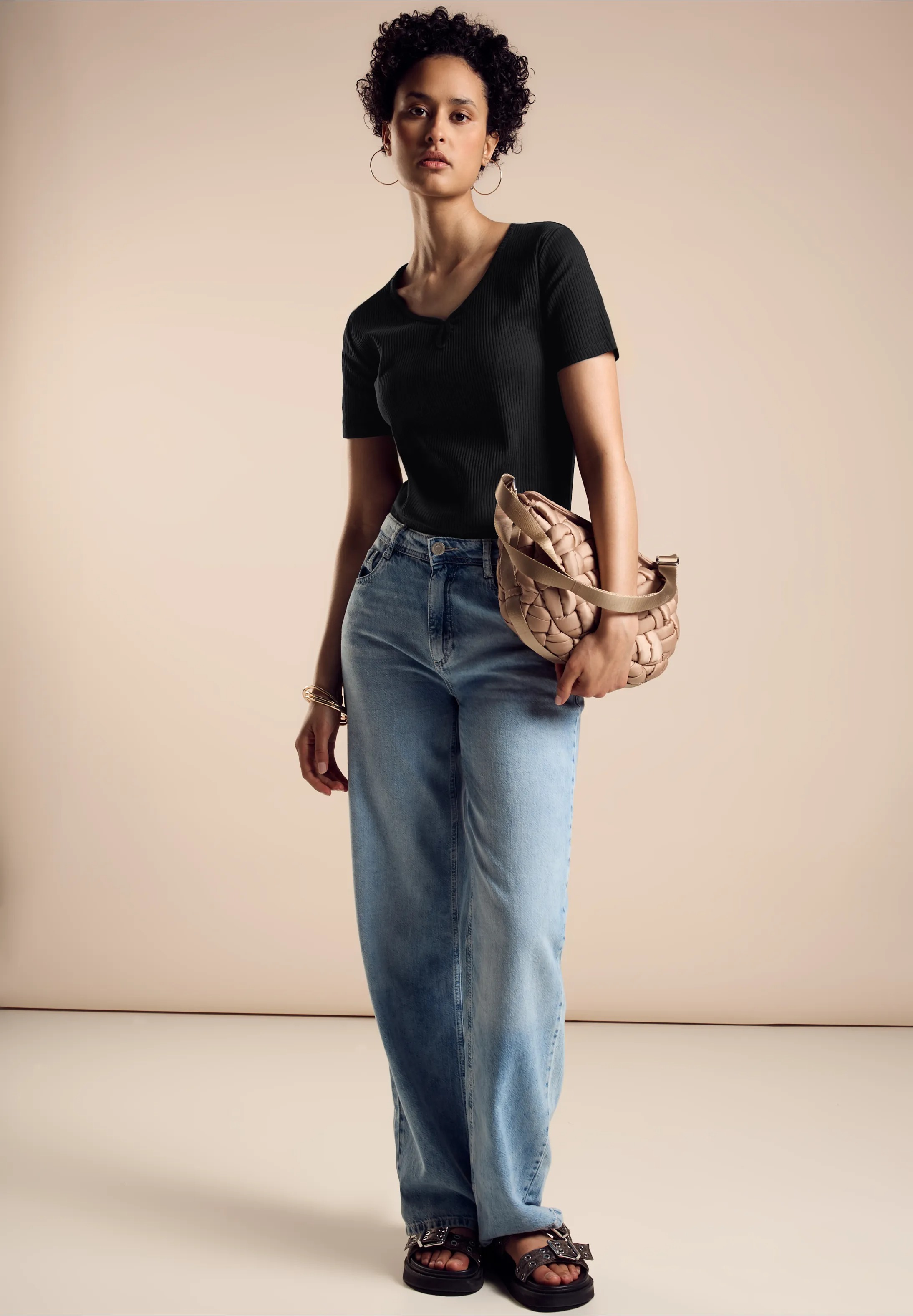 Dámske rebrované tričko Street One je módne tričko s krátkym rukávom a trendy výstrihom do V zvýrazneným rozparkom.