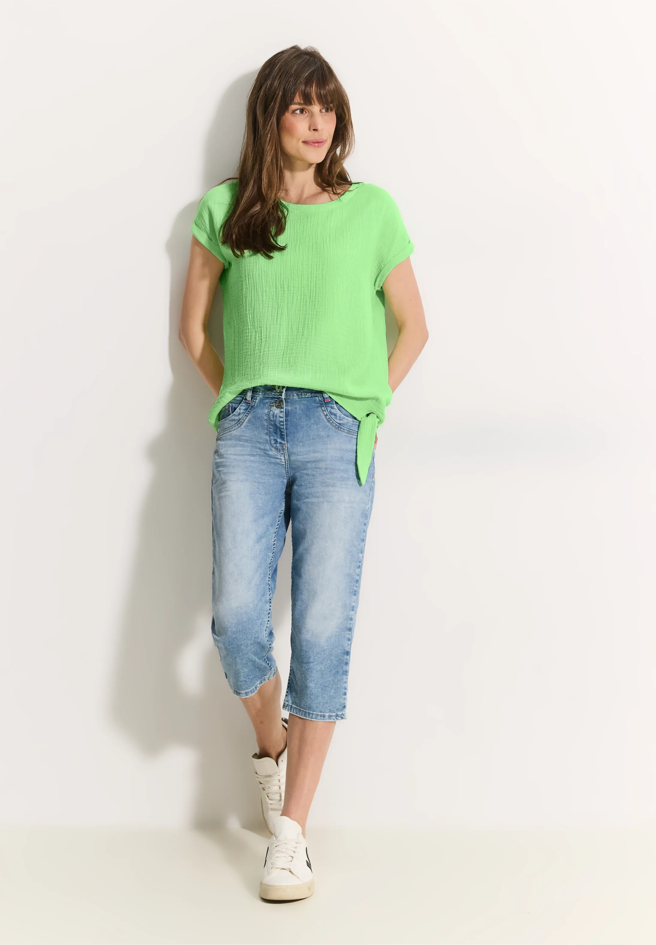 Mušelínová blúzka od CECIL pre ženy je letnou voľbou s okrúhlym výstrihom a ozdobným uzlom na leme.