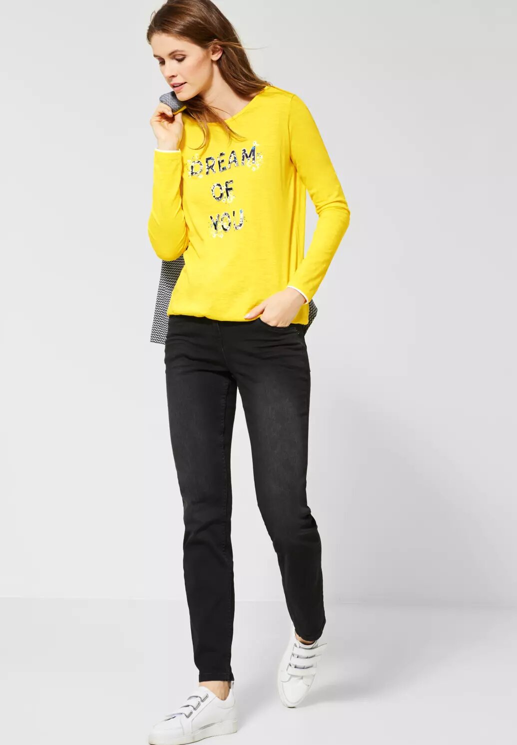 Tričko s dlhým rukávom s potlačou na prednej strane zvýrazňujú trblietavé nity.