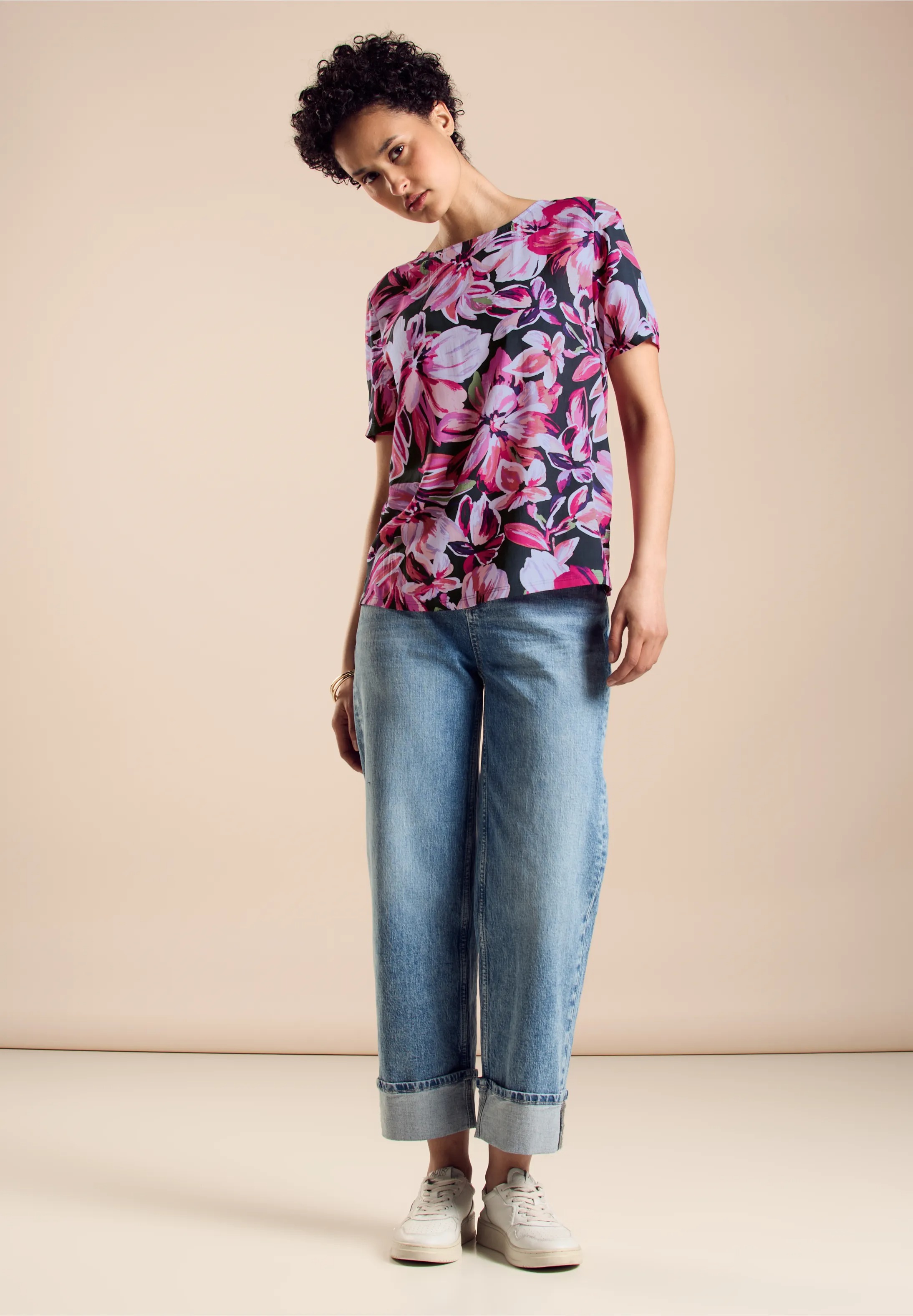 Dámske tričko Street One z materiálového mixu je očarujúce letné tričko s atraktívnou listovou potlačou, klasickým výstrihom a krátkym rukávom.