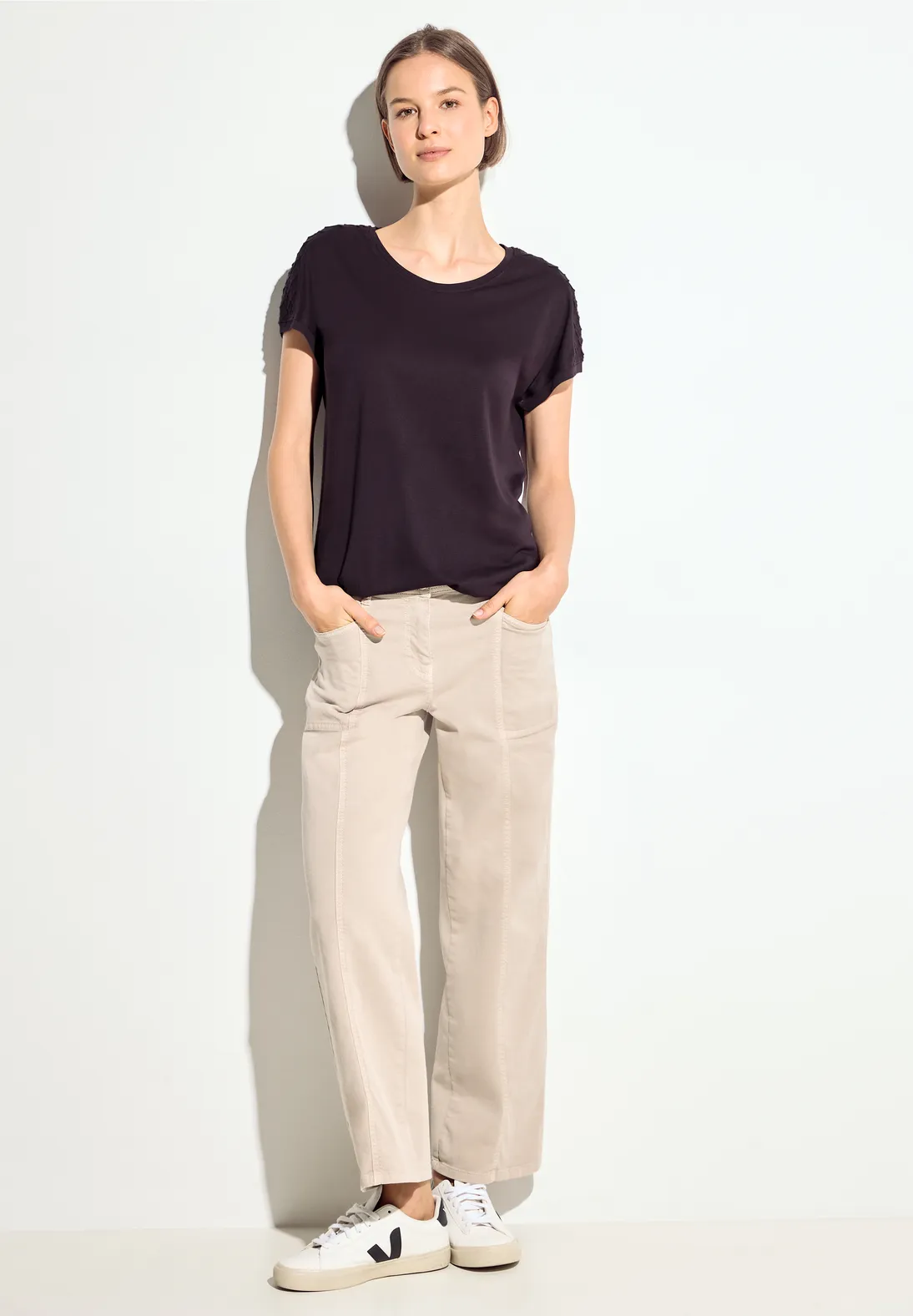 Ozdobné tričko od CECIL dodá každému outfitu osobitosť so zaobleným výstrihom do V a pôvabným elastickým pásom.