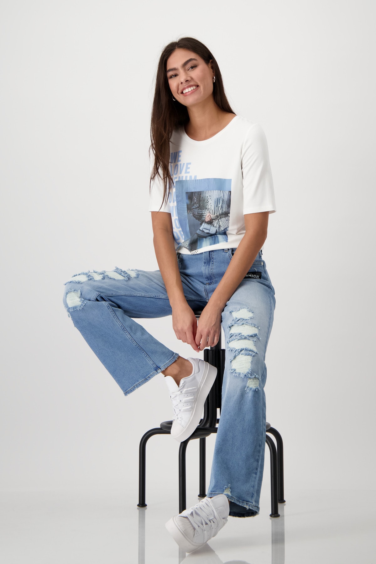 Tričko s krátkym rukávom ponúka jemný pocit a je vybavená fotografickou potlačou zdobenou kamienkami a nápismi.