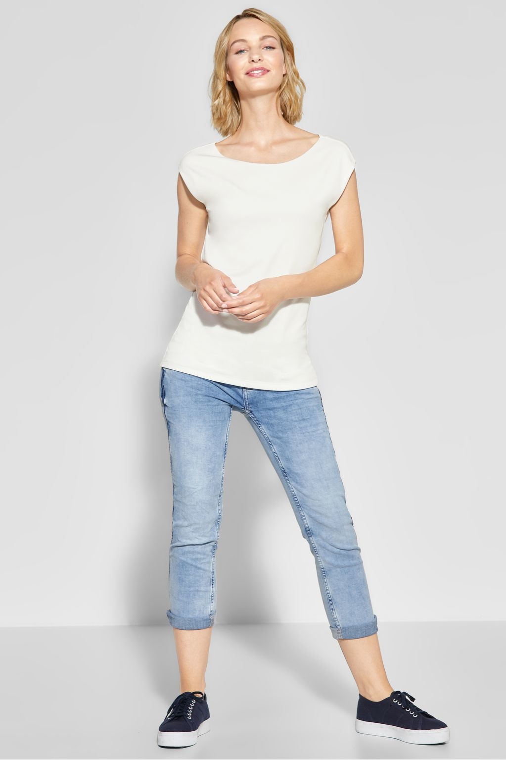 Tričko s krátkymi rukávmi, nadmernými plecami a loďkovým výstrihom.