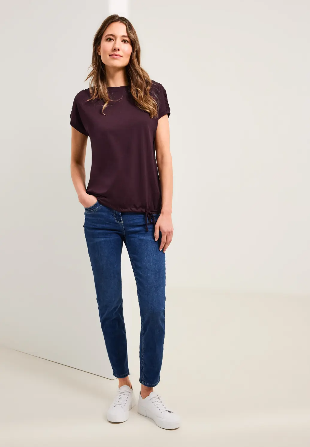 Cítiť sa voľný! Dámske dámske tričko CECIL s lodičkovým výstrihom. Sťahovacia šnúrka v leme a krátke rukávy zaisťujú pohodlné nosenie. Volány na pleciach upútajú pozornosť, ktoré dodávajú jednofarebnej košeli veľmi individuálny vzhľad.