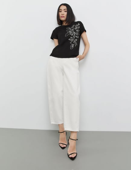 Toto tričko si nenecháš ujsť! Vďaka umiestnenej kvetinovej potlači a kamienkovému zdobeniu je skutočným pútačom. Vyrobené z príjemnej organickej bavlny, je veľmi pohodlné na nosenie a umožní vám užiť si deň naplno. Prečo to nespojiť s mamami džínsami a sandálmi pre neformálny, ale štýlový vzhľad!