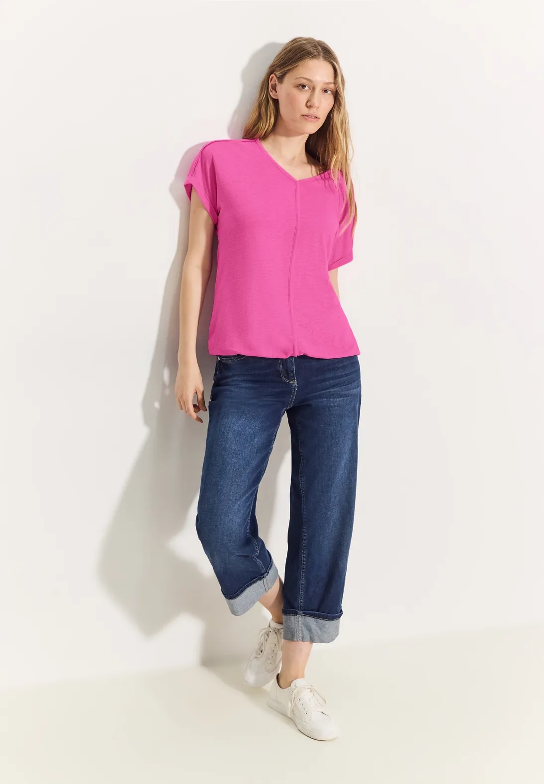 Ľanové tričko CECIL pre ženy je košeľa s krátkym rukávom s lichotivým výstrihom do V s lemovaním a módnym elastickým pásom.