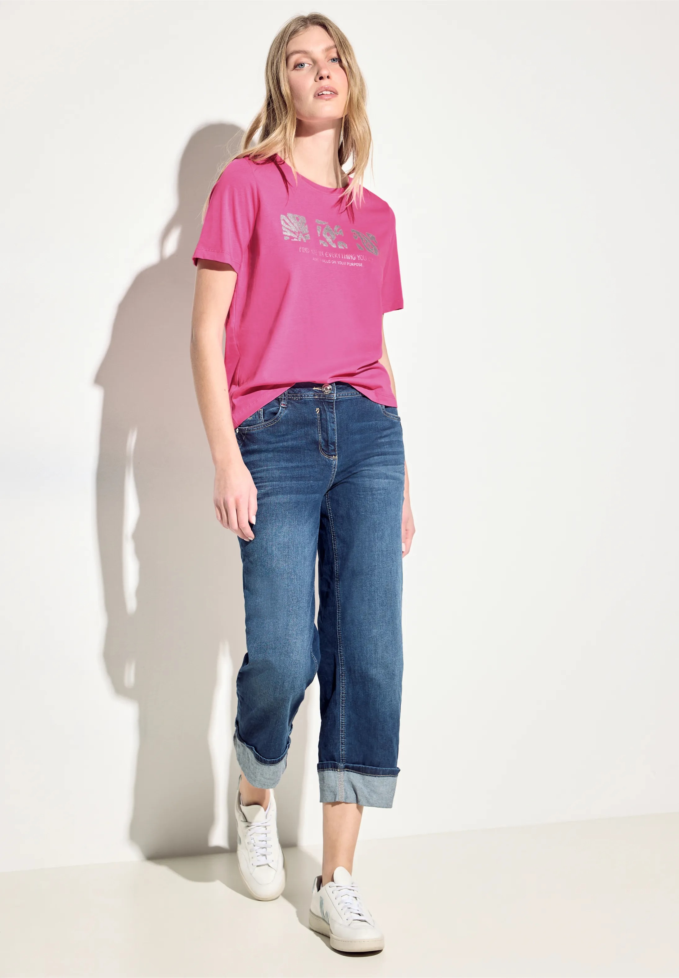 Dámske tričko CECIL je trendy košeľa s krátkym rukávom a klasickým výstrihom pre nadčasový vzhľad. Vyrobené z čistej bavlny, pohodlne sa nosí a má pohodlnú džersejovú kvalitu. Trblietavá predná potlač s nápisom dodáva košeli moderný a hravý nádych, vďaka ktorému upúta pozornosť.