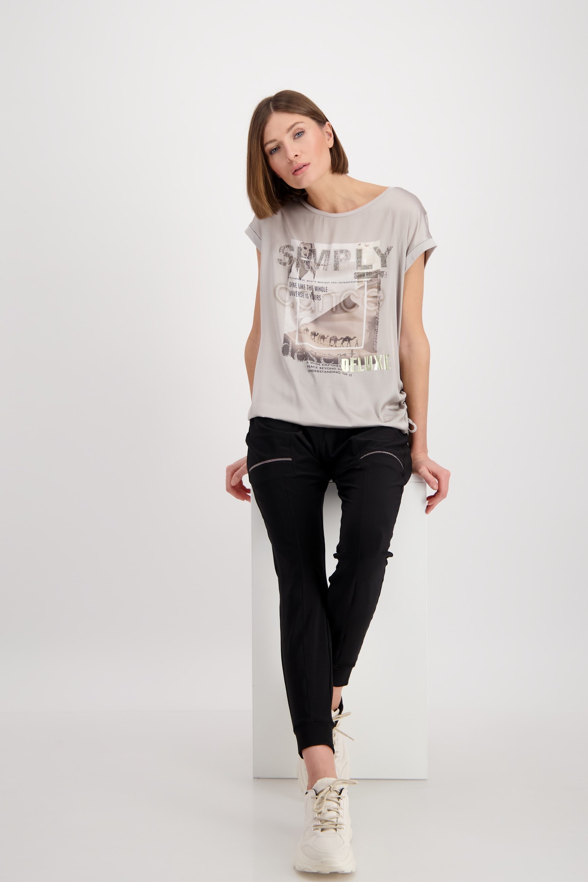 Prednú stranu zdobí trendová a módna fototlač s fóliovým nápisom a trblietavým nápisom a dodáva košeli s krátkym rukávom očarujúci nádych.